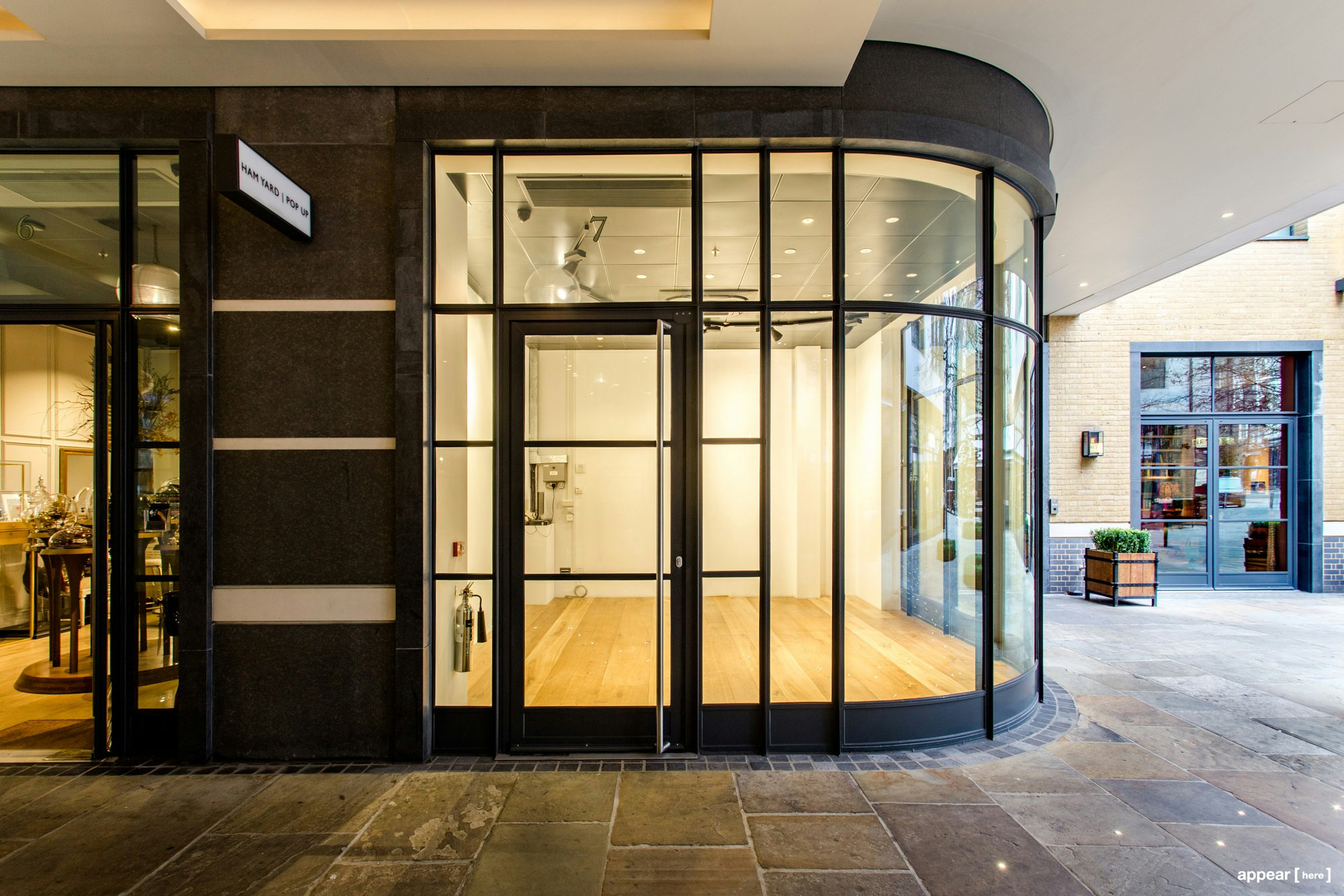 This space is one of the chic boutiques overlooking the courtyard and restaurant. It has floor-to-ceiling glass at the entrance, and inside features white walls, pale wooden floors and a high ceiling painted black. It’s an exercise in stylish simplicity, and a space that will be easy to work with.