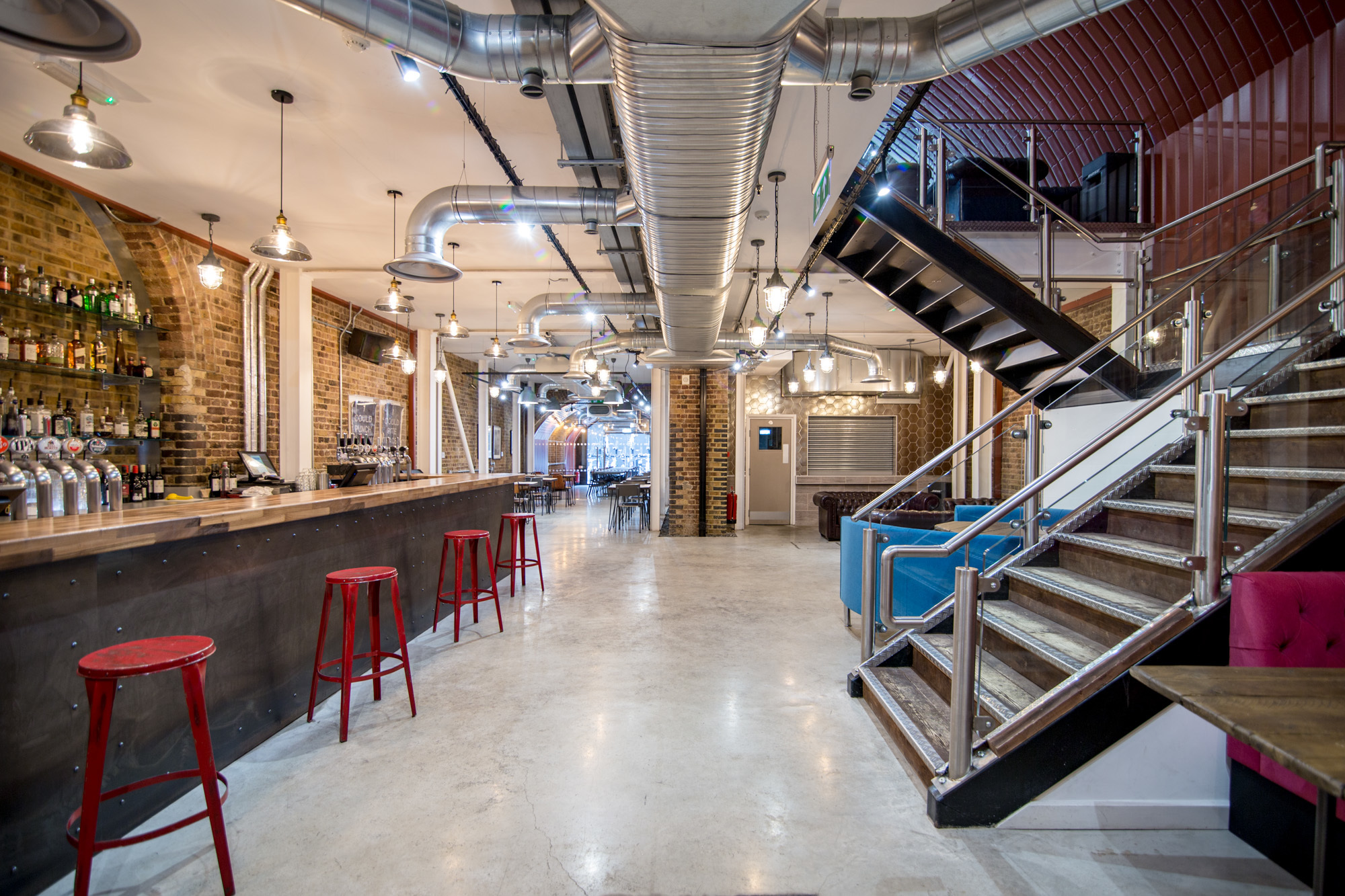Right in the heart of Shoreditch on Great Eastern Street, is this large event venue or restaurant space to rent. Looking Glass Cocktail Club’s sister bar/restaurant still shows signs of its former life as an ironworks in its industrial styling, cast iron pillars, high ceilings and old lift, which is now a suspended DJ booth. This three-tiered space is also equipped with a cocktail bar, charcoal oven, and a full sound system. The space is available for either dry hire or full hire.