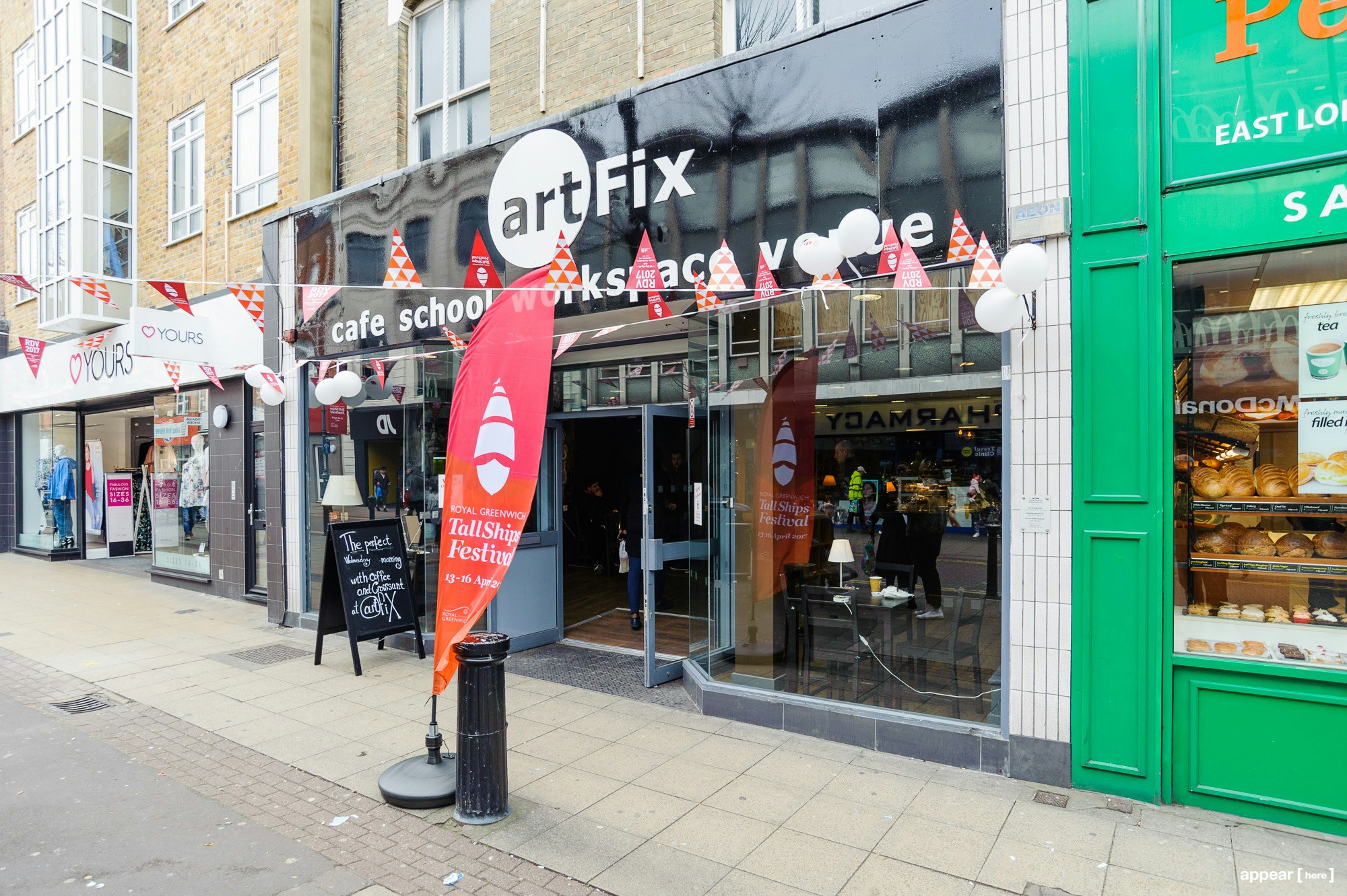 With regeneration projects springing up around the neighbourhood and Crossrail on the way, the bustling, cosmopolitain area of Woolwich is set to return to it’s once-grand past. Jump the queue with this flexible two-tiered space on Powis Road. The space available is on the first and second floor of this flexible building, above a cafe. The two floors have a clean, contemporary decor of white plaster walls and dark wooden floors throughout. On the first floor is an open gallery space. Further stairs at the back lead to a studio space on the second floor. Key features include boutique spotlights and large front windows bringing in lots of natural light. Close to Woolwich Arsenal Station, the space is on a busy street with neighbouring businesses including Santander Bank, Starbucks and New Look.
