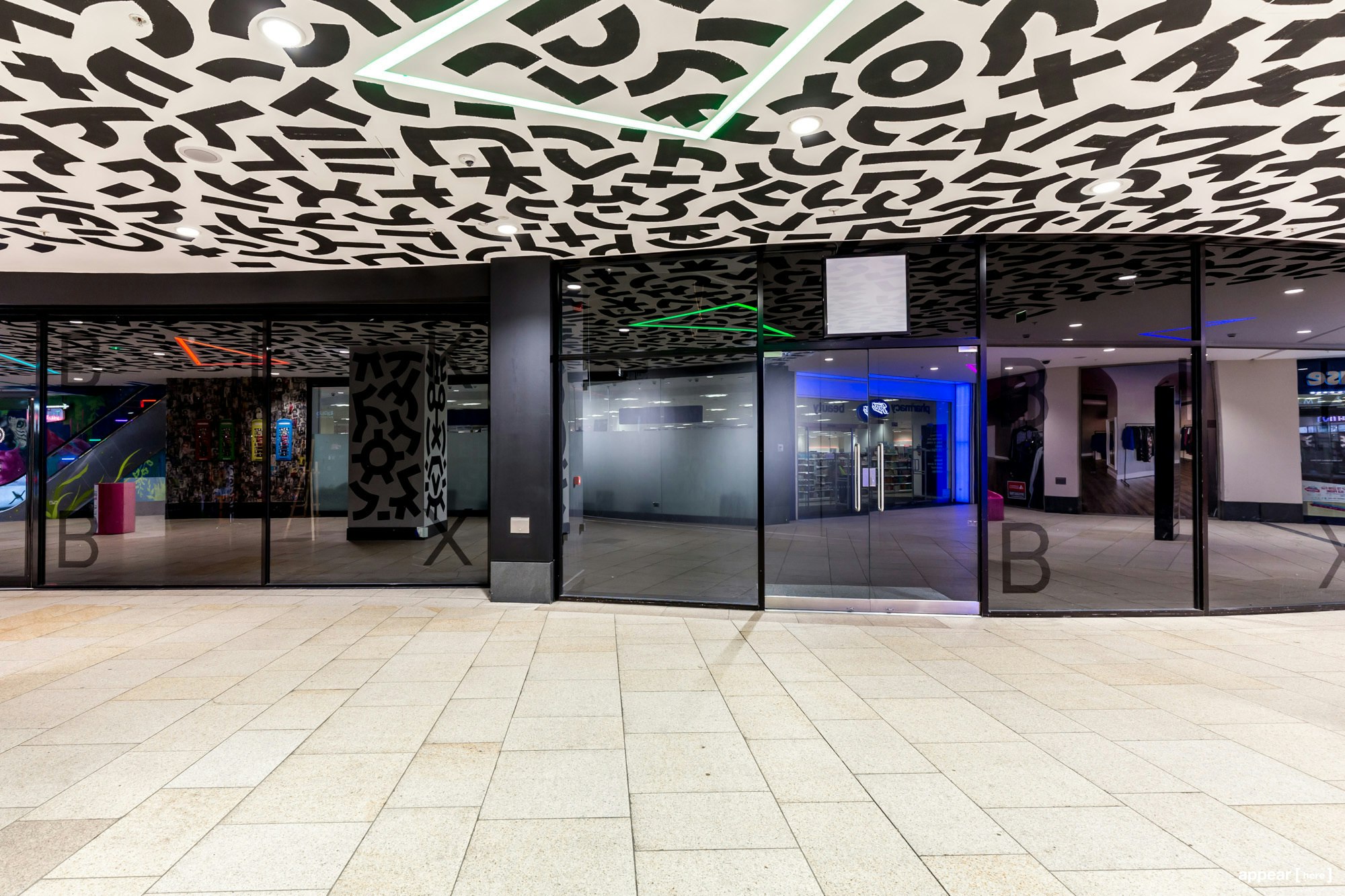This space is a large, high-ceilinged full shop to rent in Trinity Leeds, one of the largest shopping centres in the north of England. With dark walls, floor and ceiling lit by spotlights, this space could work for retail brands, or for events. The space feels open, with floor-to-ceiling glass windows. The shop also features a kitchen space in the rear.